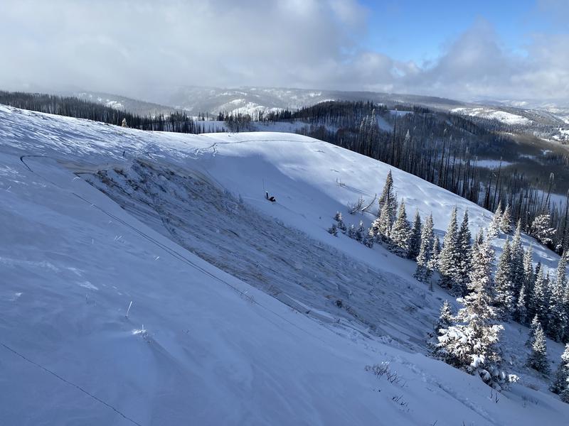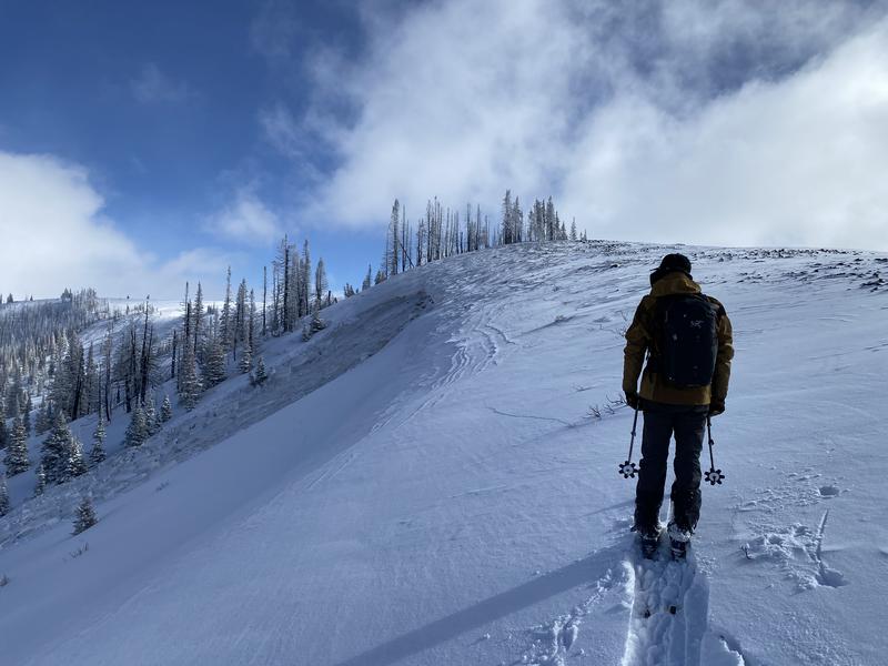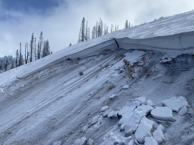Remotely triggered avalanche from roughly 150 feet away skinning the ridge. Andrew was walking and stepped on a thin area where the sage brush was poking through the snow surface. We felt the slope drop and watched the crack travel up the ridge and the avalanche occur. The structure was a hard slab of wind-drifted snow above the pronounced weak layer near the ground.