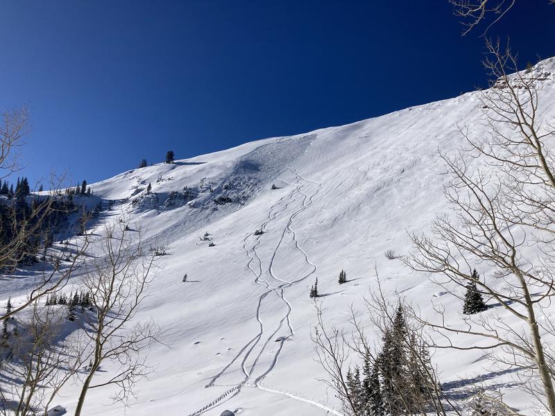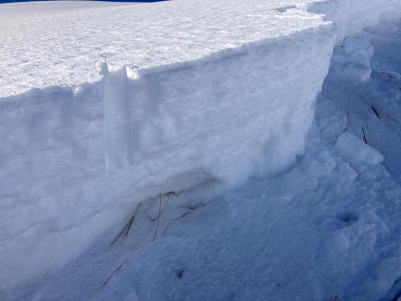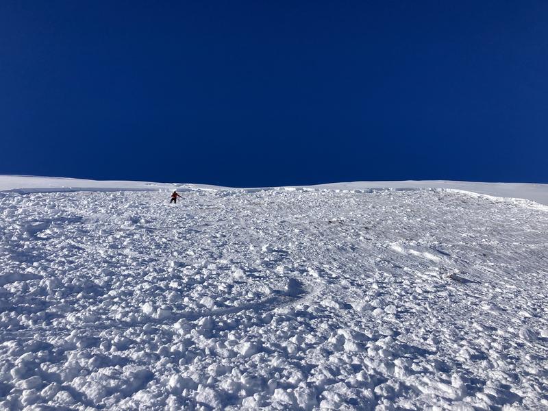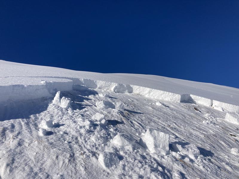Pretty large slide in west monitor on the more NE facing right side. Buddy dropped in and it ripped out on his 2nd turn, he was able to pin it left and get out of the way. Ran on october facets and took the rest of the pack with it, 18-24" deep. 800' or so vert all the way into the flats