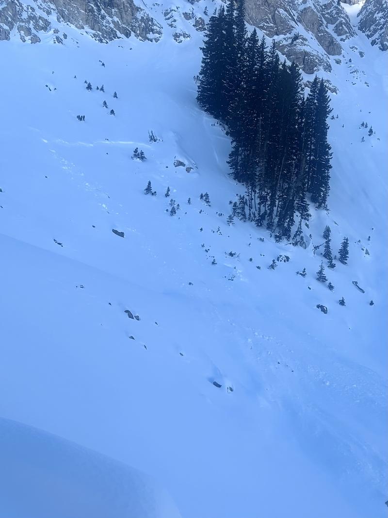 The weak layer failed at the interface to this m/f crust and was a 10cm layer of Fist Hard 3mm Advanced Facets. The Slab and or HS at the Crown was 70cm deep and consisted of a variety of faceted layers and disintegrating crusts that were on average 4 Finger Plus throughout all the old snow that fell prior to the most recent event. The new snow (and top layer) from the recent event has settled to 25cm of Fist Hardness. The steepest part of the slide (and where the Crown Profile was dug) was 40 degrees, with the flanks having slope angles of 35 degrees. The Bed Surface was very slick and hard with 5cm of storm snow resting on top of it.