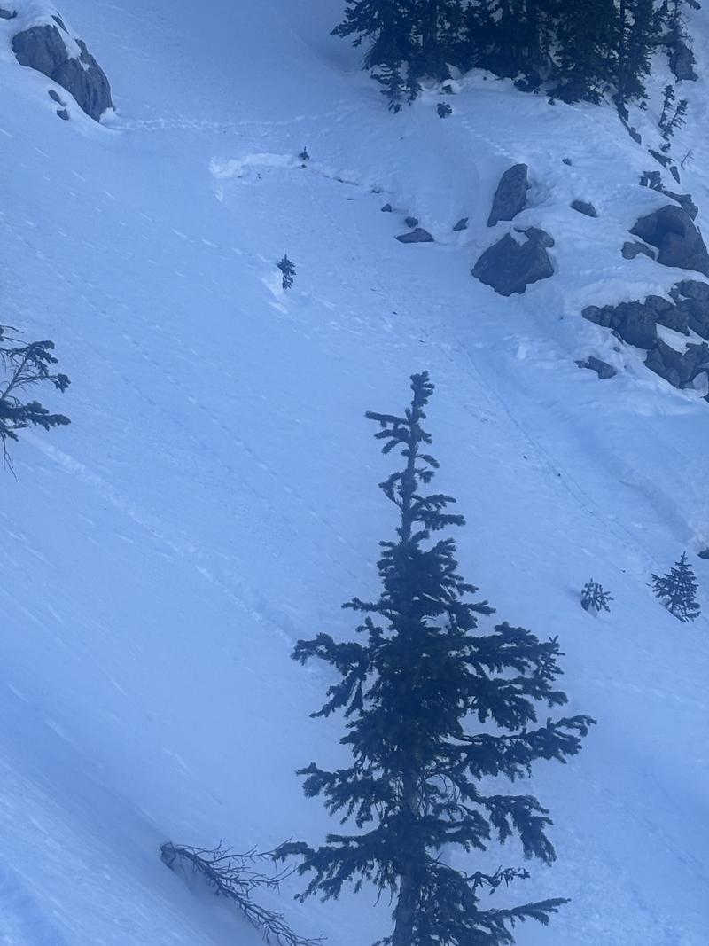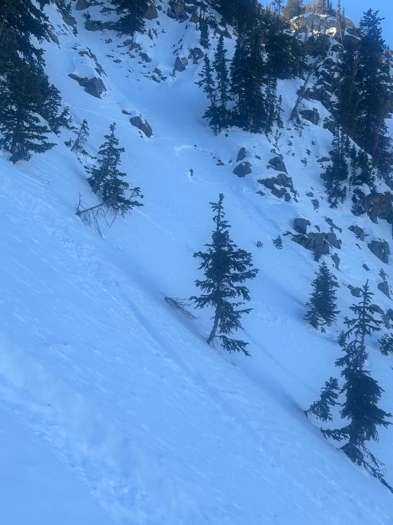Likely occurrence: Slide looked very similar to Honeycomb avalanche I observed and reported. There was 5cm of faceting surface grains on top of the bed surface. Best bet would have had a Natural SS release near the end of the latest event during a period of High PI, and this stepped down to create the above slide. Crown broke at the entrance to the bowl as it opens up, and this occurred at a rocky ledge. Crust was not visible in the rocks, and they were cleaned off; but directly below the rock ledge it ran on facets above the m/f crust. Of note, in areas undisturbed by this or any other slide activity the HS in the region was at least 85 to 90cm.