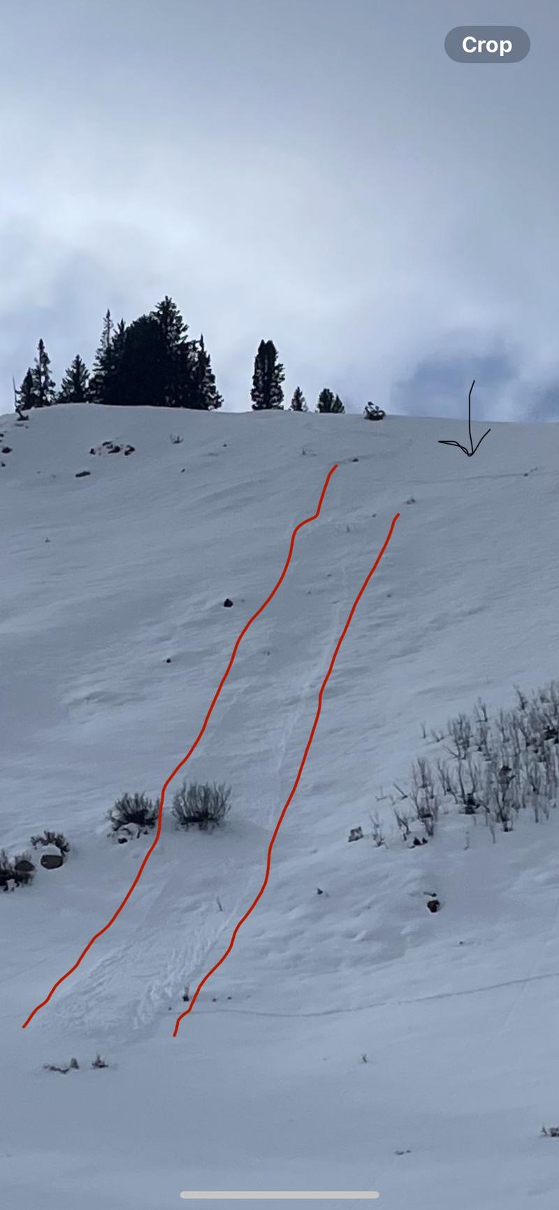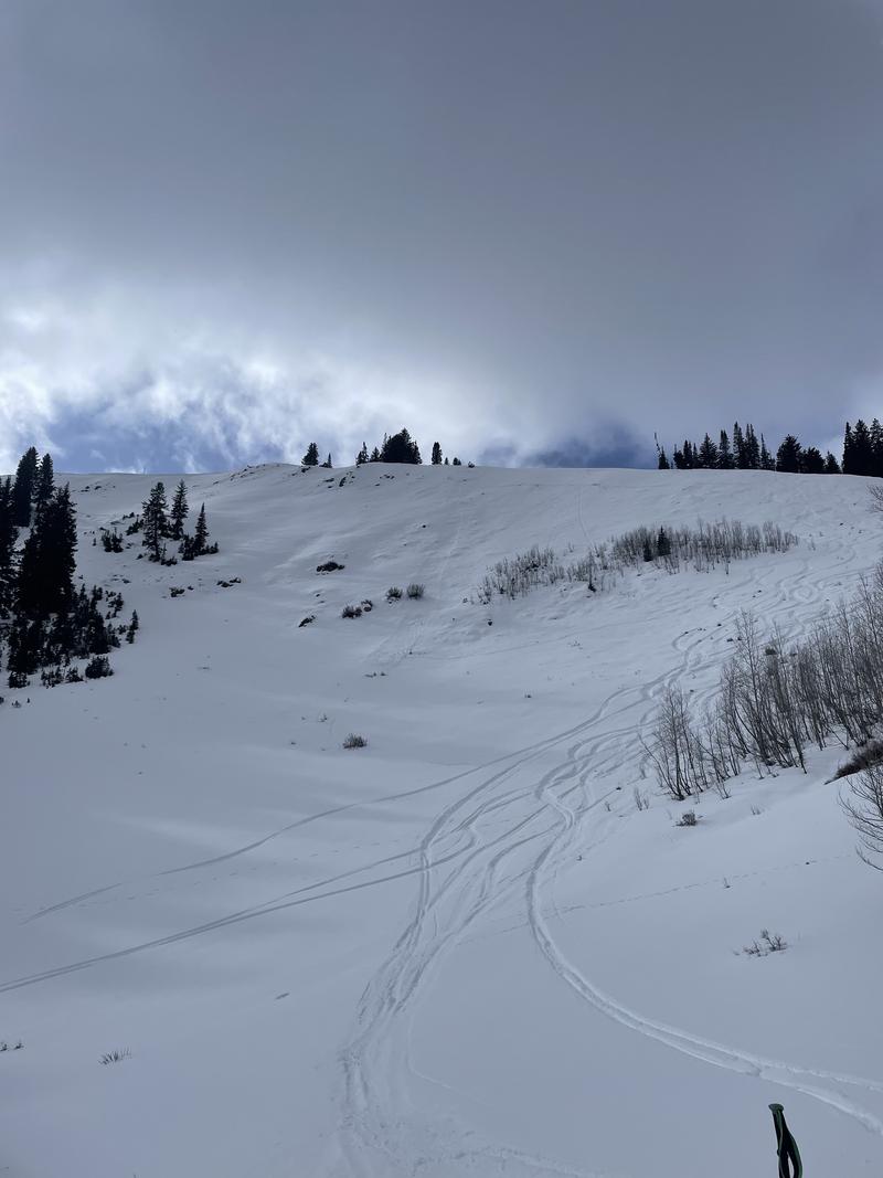 We saw the avalanche path at 11:30 AM while skiing Scott’s Backdoor. The slide was not present yesterday when we were in the Guardsman/Scotts Pass area. From the ridgeline we saw wind loading overnight, particularly on east facing aspects. Our skin tracks on the ridge from the previous day were gone from last nights wind. The avalanche crown was visible when looking into PCMR Scotts Bowl. We skied to Scotts Pass and took photos from below but it was challenging to photograph due to lighting conditions. From below we saw ski tracks leaving above the slide path. We believe the skier was above the slide and skied out.