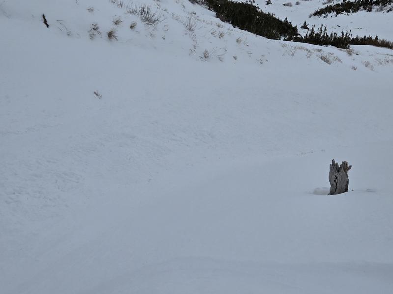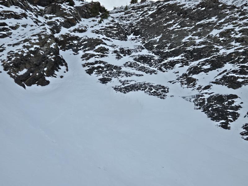 Dismally flat light for photography but below you can see the debris and part of the partially filled in crown. It looked like a sluff came down and brought a bit of slab with it when it hit the apron. Steep cliffy terrain between Mongo No and Barietto.