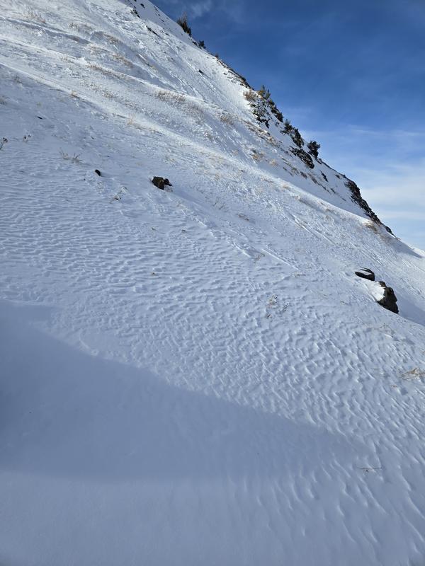 Joey was right, winds were moving snow. We could feel some small, slabby structure forming. A few tiny slabs were kicked off by skis.