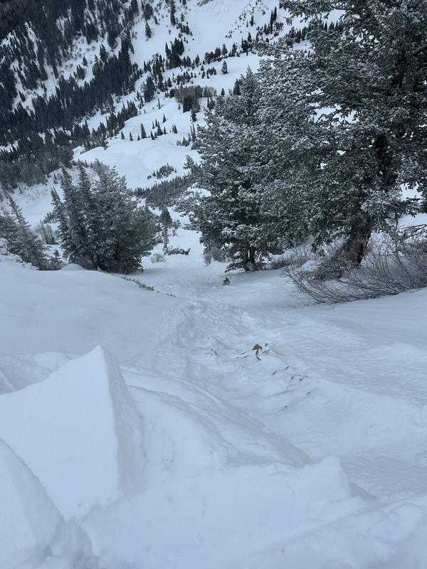 Triggered a small avalanche on an east facing slope with a touchy cornice. It was 12" deep 30' wide and ran all 600' of the path.