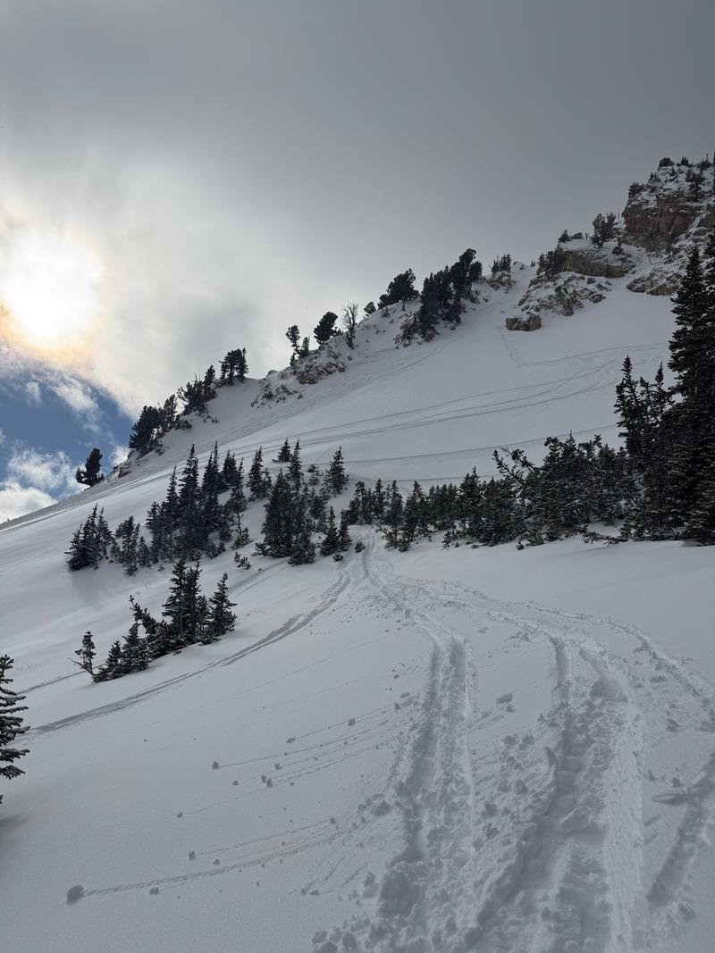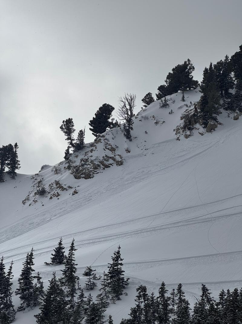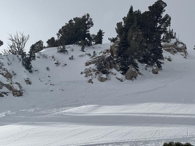 A group of four snowboarders triggered a sizable wind slab at the bottom of one of the little chutes on Cardiff peak. Much snow was entrained but thankfully no one was swept up in it. We made a brief visit to the site on our way down. We found a stout wind slab across the entire slope, large cracks visible in the bootpack the previous party set up the chute. A quick excavation by my partner found a dense base covered by fresh snow, the wind slab capping off the snowpack. As we left the area my partner noticed shooting cracks come from my skis while I remarked I might have heard a whumpf.