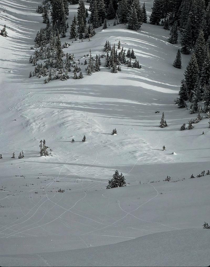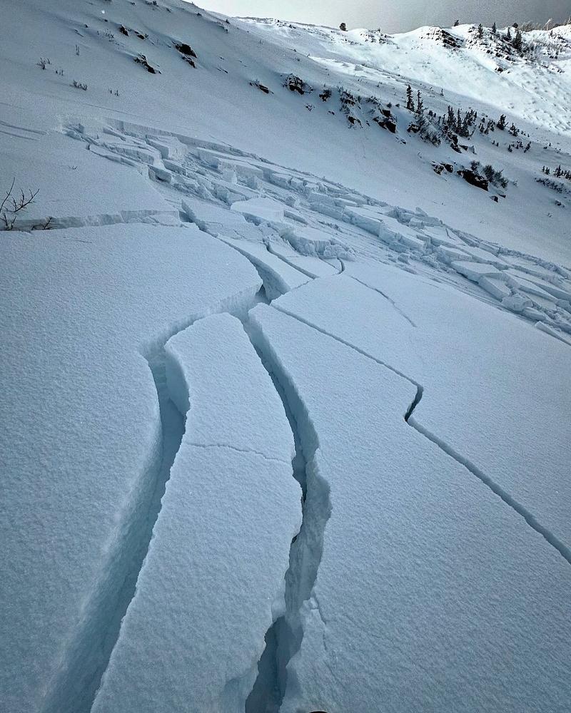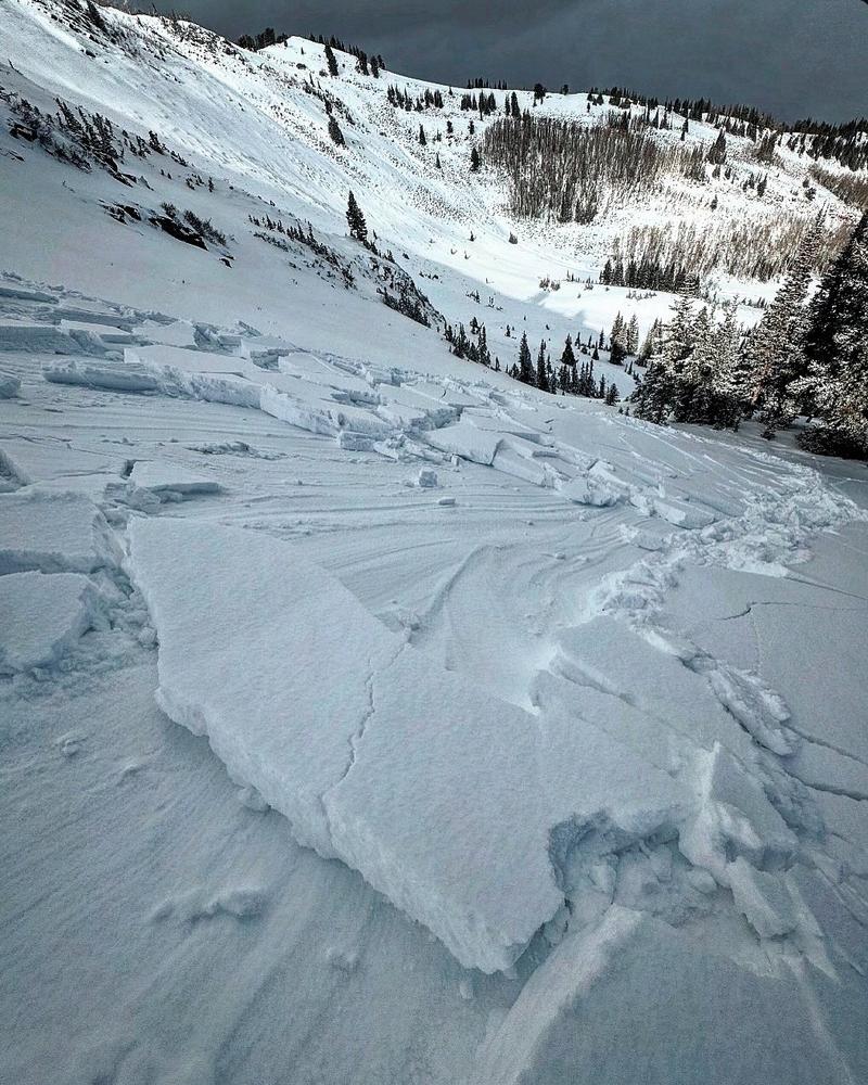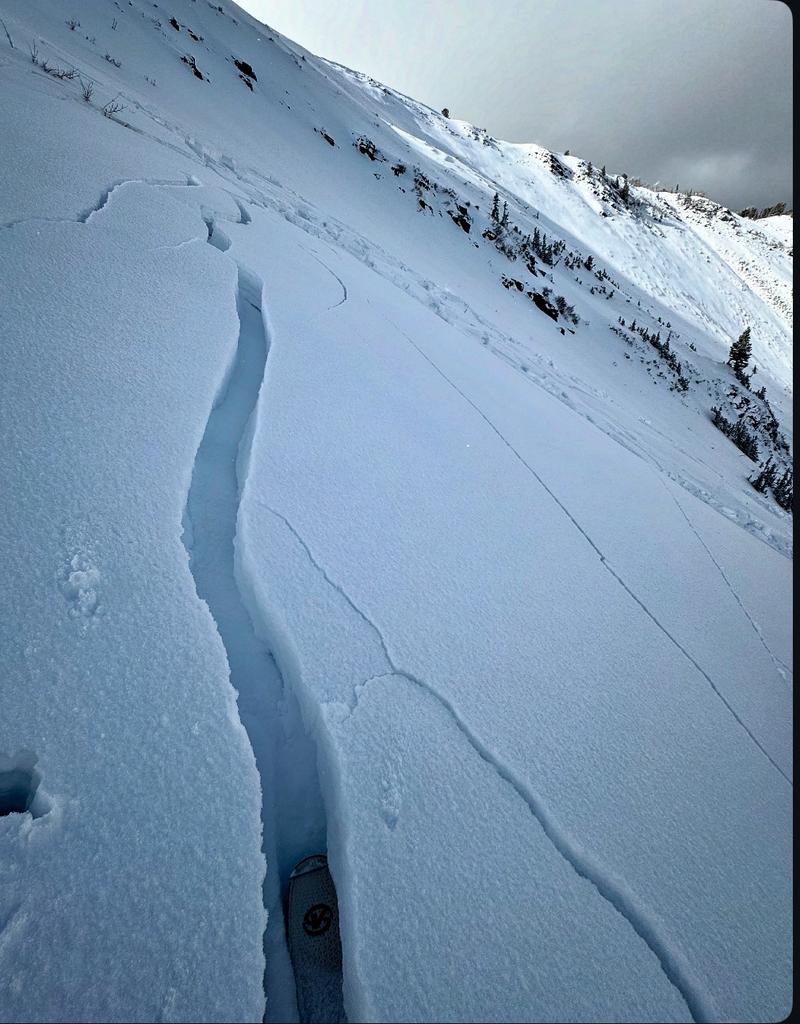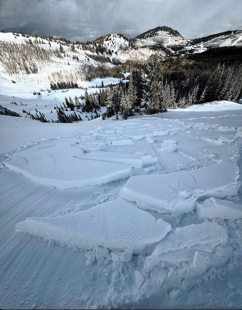 Triggered this avalanche remotely from about 200 feet away on flat terrain. We had already triggered another pocket just a few minutes earlier and were walking out when we remotely triggered this one. The first pocket was triggered right at my ski tips and window pained the slope but it did not run due to low angle terrain at the bottom. The cracks were around a foot deep all the way down to the early season facets. and looking closely revealed that it was a hard slab. The interesting thing is I was walking on basically the surface with just a few inches from last night on top, then I took another step and hit a thin spot in the slab and collapsed the whole slope.