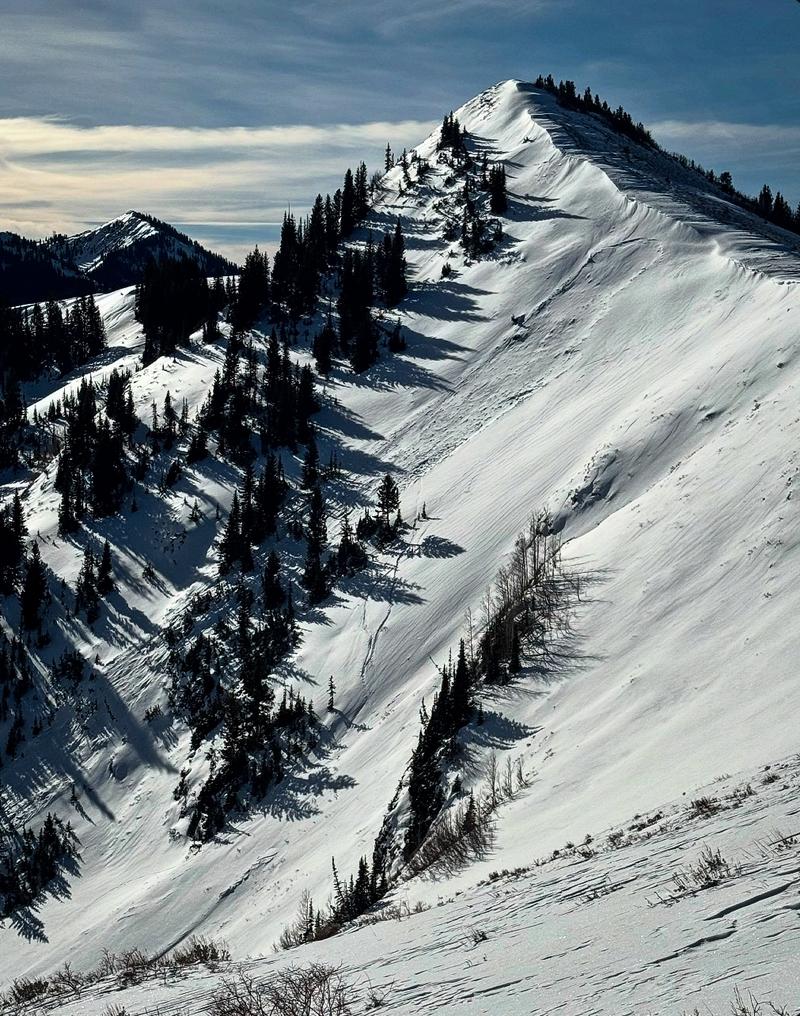 Saw this avalanche today on Scott's Peak, must have been triggered either Monday or Tuesday because I was in the area late Sunday and it wasn't there. There where tracks going in and coming out. From the looks of it, it was triggered about a fourth of the ways down the slope and quite a ways above the entry tracks the exit tracks were about 40ft down. Looking at the crown from a distance and the obvious wind loading on slope it appeared to run on the PWL at the bottom of the pack. It ran full track through a bunch of pine trees and took out a few on the way down.