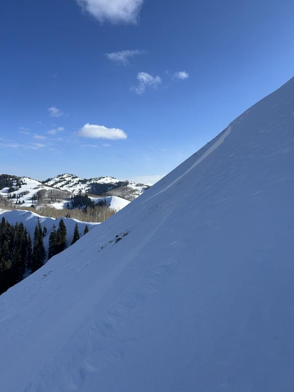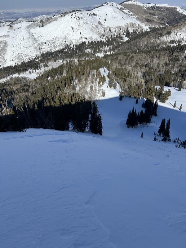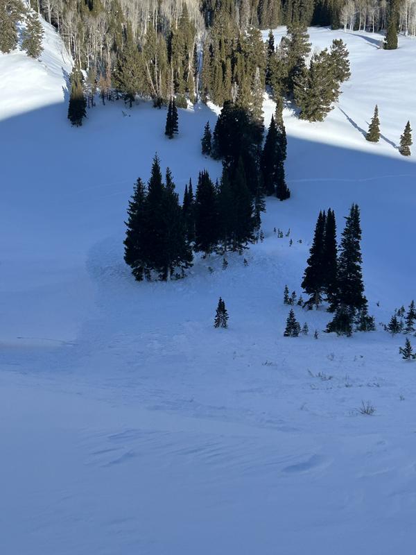 The attached photos were taken on the left side of the avalanche path. The snow above the slide consisted of a slick wind slab. The crown appeared to be approximately 2 feet deep, with the flanks around 1 foot deep. The slide was approximately 100 feet wide, give or take.