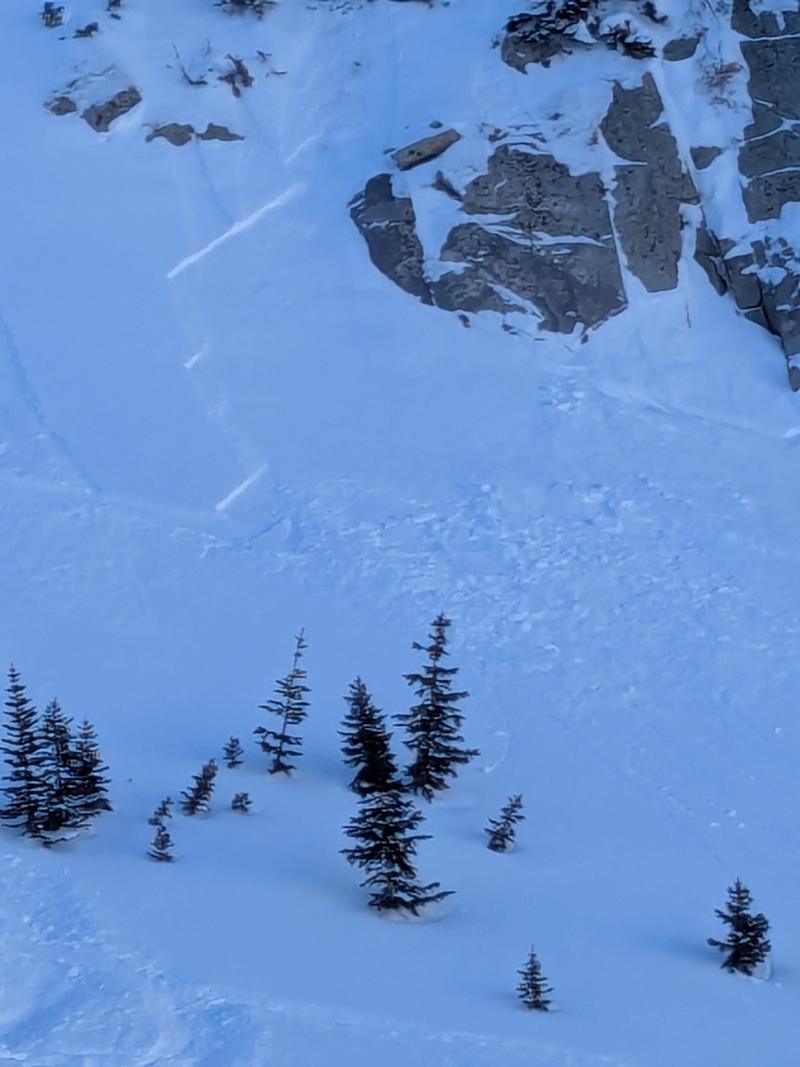 Forecaster Comments: This is an interesting slide. The ground surface here is steep enough to create avalanches, but as the season's snowpack gets deeper the slope angle lessens to well below 30 ° and it becomes harder to trigger avalanches within the surface snow.