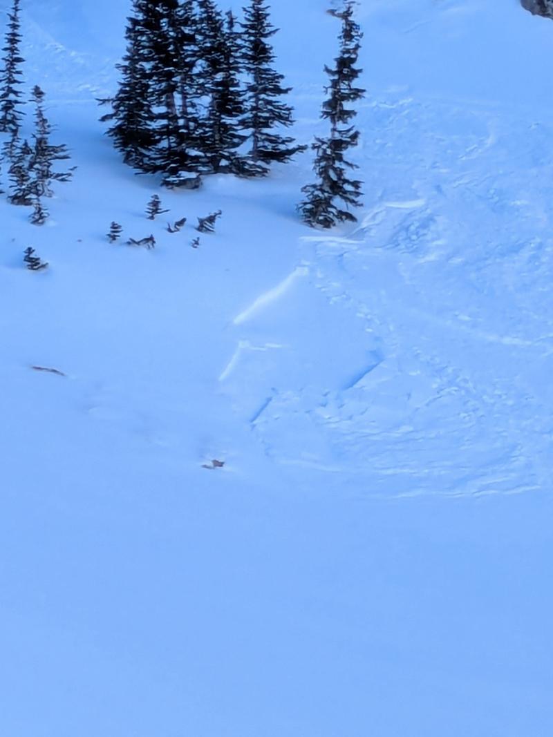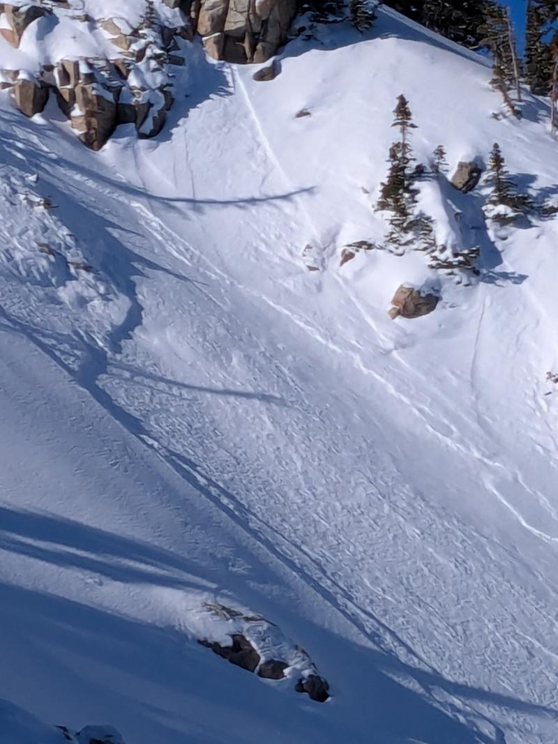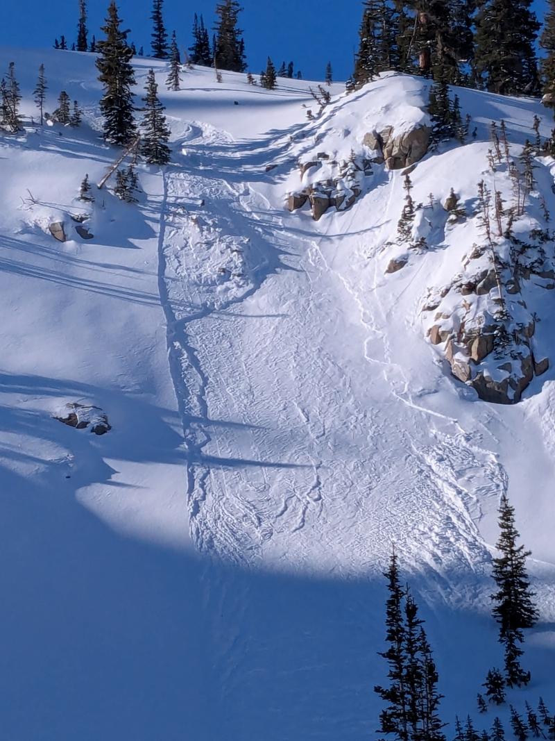 3 separate slides in 1000 turn gully. 2 on skiers right of gully., very small thin and pocket, wind was probably involved. I think I saw a tiny similar slide heavens gate too. all N E all 3 snowboarder triggered. bottom feeding on 6" lower density snow from weekend.