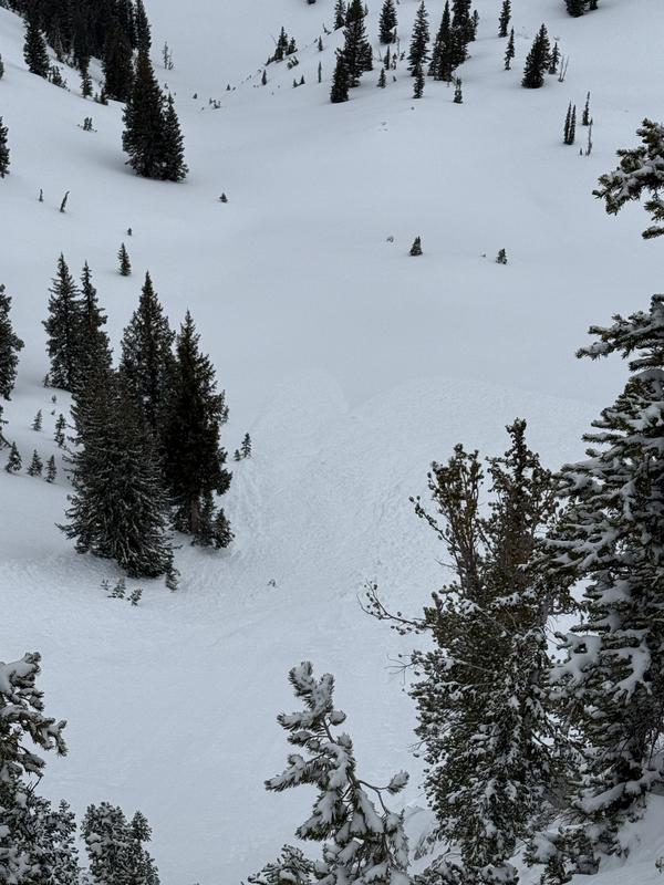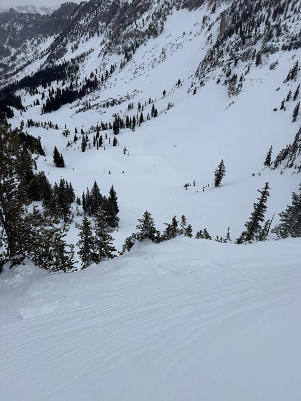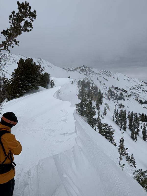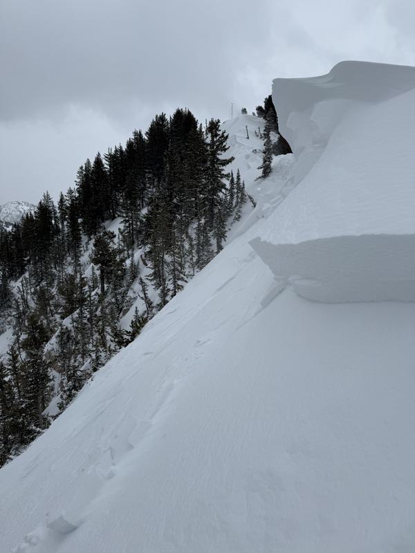 While Transtioning to ride the south face /two trees on superior ridgline we encountered high winds and large cornices developed from last night/this morning overhanging the North side with lots of windloading. We were careful, but unintentionally trigged a small cornice break that ended up propogating a decent avalanche on what I would call Power outage face. It moved quick and ran the whole slope. No parties were below or near the avalanche path. The slide was at 10200 feet and North facing. The slab propogation was consistently 2ft deep maybe a little more in some areas, failing on a faceted bed surface.