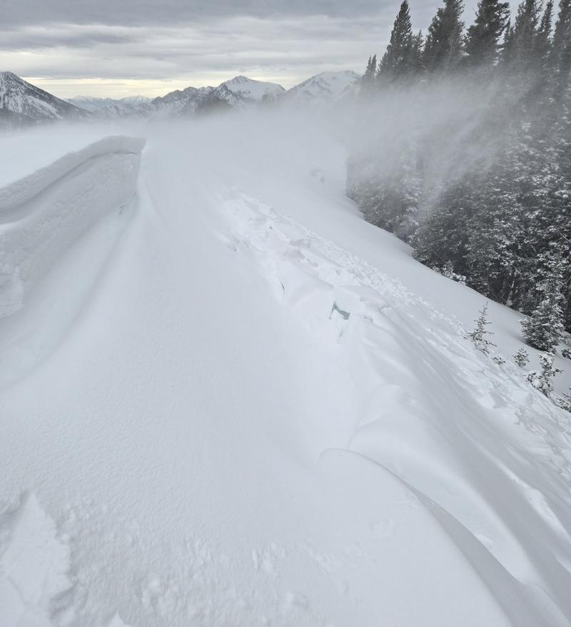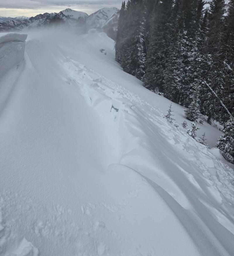 Rapidly loading cornice popped off and triggered a wind slab which slumped down into low angle terrain. Strong winds moving the heavy snow without much thought. Regrown cornice failed again with a little nudge.
