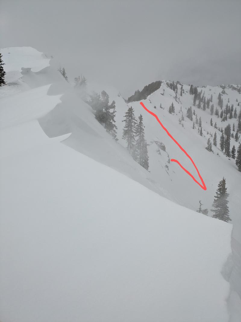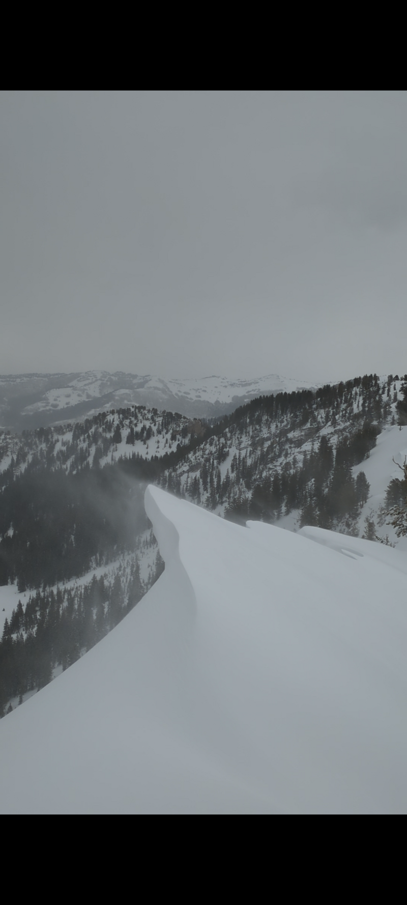 Saw this ridiculous looking cornice and couldn't not throw my Paracord around it, from a safe distance, anchored to a tree, ensuring no body below... This slope is different from most ski slopes in upper days in that is unsupported from below because of steep rocks cliffs, so it easily gives up cornice falls triggering wind slabs that then gouge to the ground and run to the flats.