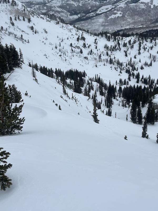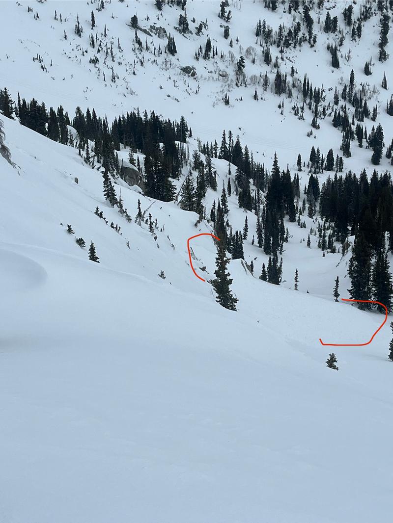 Ascending the Patsy ridge this morning do a few laps in the trees. Came upon a solo split boarder and another group having a discussion. Apparently the split boarder had been ascending the ridge after skiing in TLP and remotely triggered this slide. Did not stick around to gather the details. Ascended a bit further up the ridge and got a better angle of the slide.