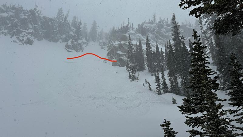 I was the second skier to drop into the Upper Mary Chutes and triggered a graupel pocket described above. Slow moving and easy to ski off. We did not observe any signs of instability up until triggering this avalanche. While exiting around Lake Mary, however; we triggered numerous collapses. It seemed the scales tipped to Considerable around 1:30-2pm. By that time, 9" @ 1.55" SWE had fallen near the base of Brighton.