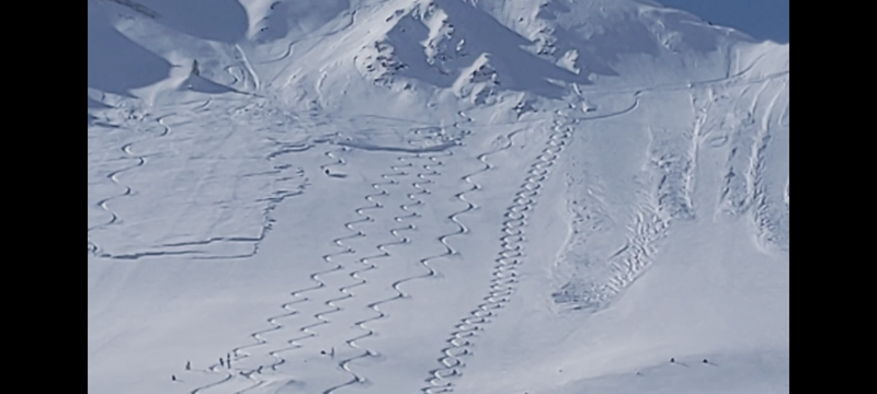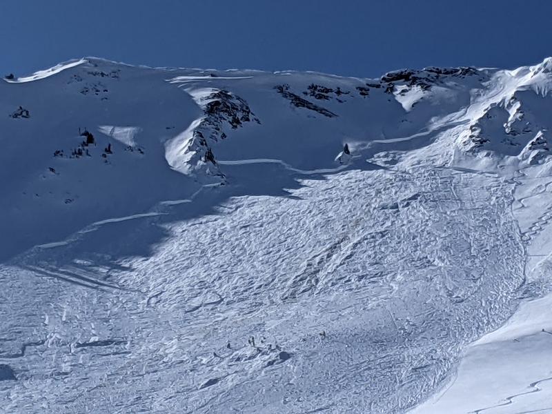 On the second lap, the seventh track on the slope triggered a large avalanche down to the PWL near the ground. There were 5 people in the vicinity. 1 on the skinner, 1 on the slope and 3 below.