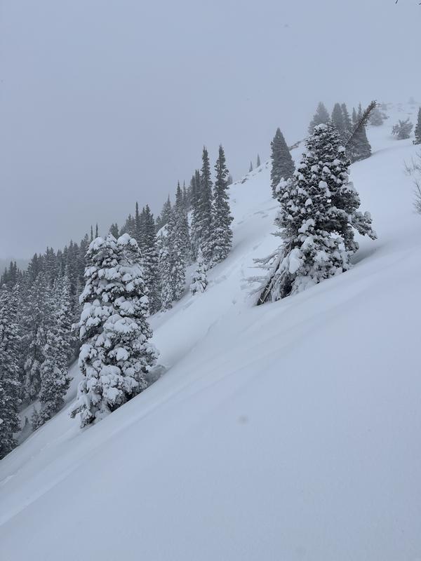 Natural avalanche occurred on northern slope of west desolation ridge. Spotted around noon, the avalanche looked fresh with little wind buildup. Height approximately 2ft, appeared to fail either on new snow layer or graupel layer. Could not safely approach to investigate further.