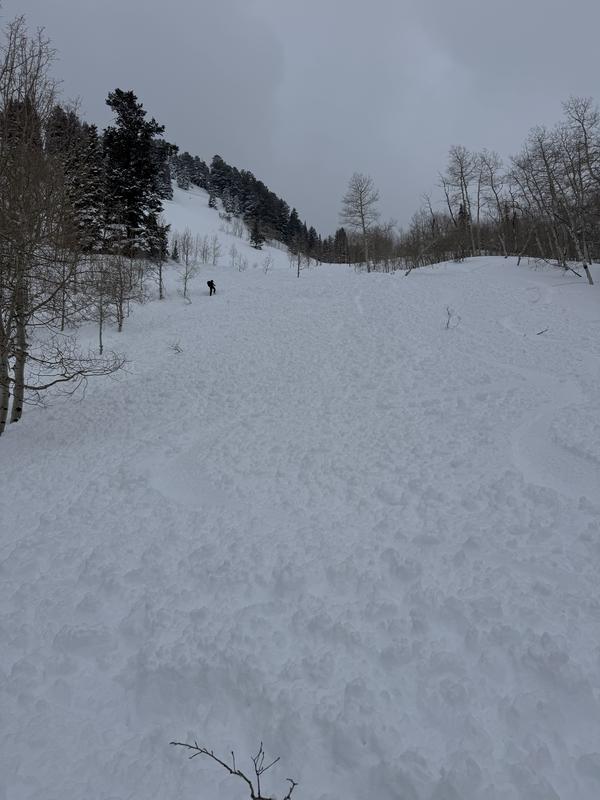 Our party of four toured in Mill A basin today. As we approached, we discussed current avalanche conditions and read the avy forecast for the day. We started with low angle safe terrain but our over confidence and complacency led us to steeper and more dangerous terrain. We ascended the ridge that separates Mill A basin from Maxfield basin with the plan to ski back down into Mill A basin. The line we chose was a 40 degree north east facing run (bulls eye for avalanches under current conditions) that starts in pines high on the ridge but opens up and leads down to lower angle aspens. I'm still wondering why all four of us thought this idea was ok. The first skier made two or three turns when the slope on both the right and left of him broke and started to slide. The skier was next to a group of pines and was able to grab onto a small tree as the slab slid by most likely saving his life. The crown was 2 feet, it propagated several hundred feet horizontally and traveled approximately 800 feet down into the aspens. The four skiers descended the slide path and conducted a beacon search of the debris pile in case of other unknown parties potentially ascending the skin track below possibly buried. There were no signs of any other party present.