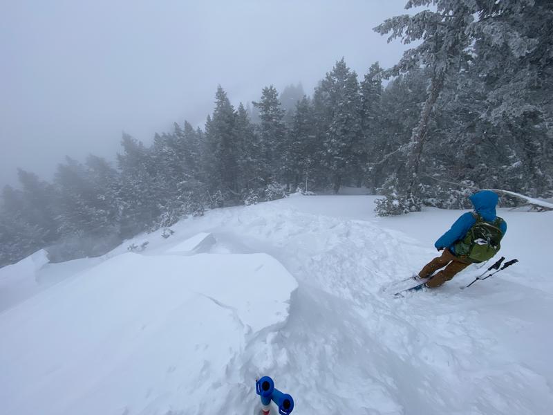 Rounded a corner on the trail that developed a small cornice from winds during the recent storm. Kicked it a few times and locally it cracked but no movement. Partner came up and jumped on it causing both the local area and about 40 feet to our left around a bend to break free. The cornice then fell onto the slope below which then failed on a slick bed surface and cleared out the slope underneath. Hard to tell how much of the area underneath the cornice was a slab (vs loose snow pushed down by the cornice), but it seemed like at least some.