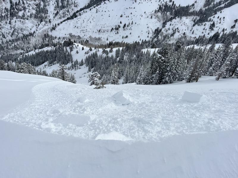 Unintentional cornice release as I was walking across the ridge of Highline. I was a few feet away from the release point. It involved wind slab and new snow; as you can see in the photo it did not propagate down to a deep slab.