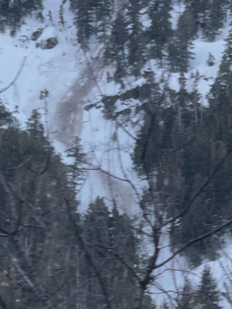 This ran from the top of the ridge nearly to the trail--about 2000 ft in total. At 7:50am, we heard three large gunshot-like cracks. In total, it rumbled for over two minutes with a lot of rocks involved. It seems to have been triggered by a cornice. It appeared to go all the way down to the facets near the ground.