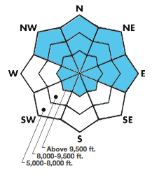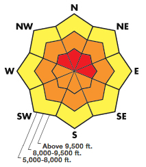 These blue-and-white roses are what we call "locator roses" meaning that they show you the general aspect and elevation where you will MOST LIKELY find the avalanche problem, not all the places where you might find it.