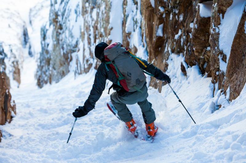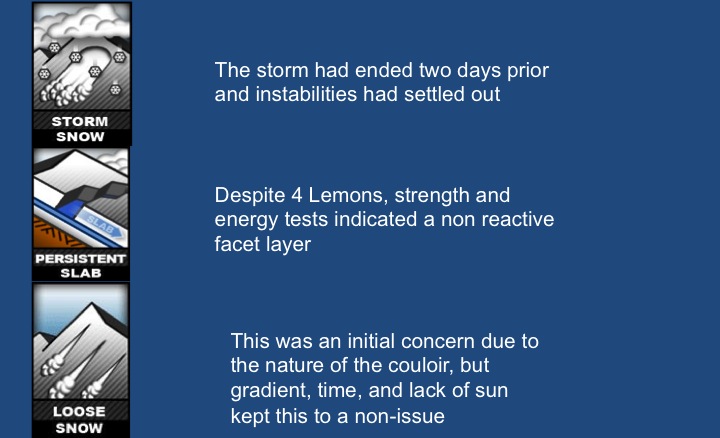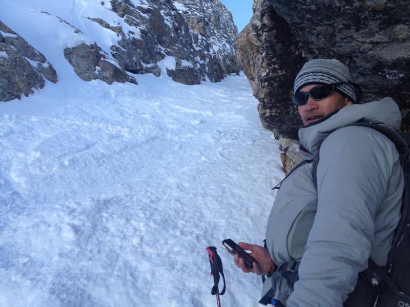 You have a little room to play with to access the couloir, but once you're in it, you're in the barrel of the gun. We noted avalanche debris in the apron and elected to travel up through the gulley of the apron. The idea being that that terrain had either already avalanched or the snowpackhad taken a direct thump from debris from above and would likely have avalanched then...not now. Still, we traveled up in two teams of two through the apron to give each other room. Once we gained the bottom opening of the couloir, we elected to continue traveling in two teams of two, skinning 90% of the way. This tells you two things: A-it never got over 40 degrees in the elevator shaft; and B-wallowingthrough the powder was waist deep...and likewise felt if we moved above any isolated areas of basal weaknesses we might stay above it on skis/skins.