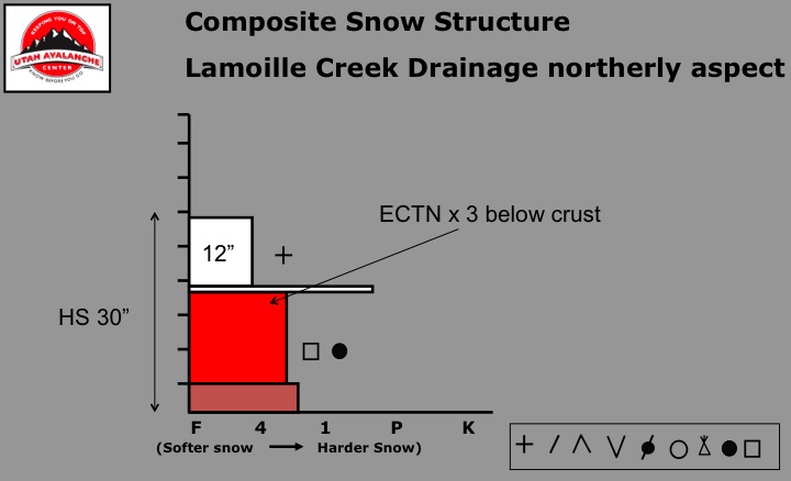 We noted no cracking or collapsing. The avalanche noted likely originated higher in the apron beneath the chute. We performed multiple probe tests to determine the structure of the snow below the chute and is outlined below. It had 4 of five lemons...the four being the top four below - Of note, the faceted layer was 4F hardness and did not seem overly weak and unconsolidated.