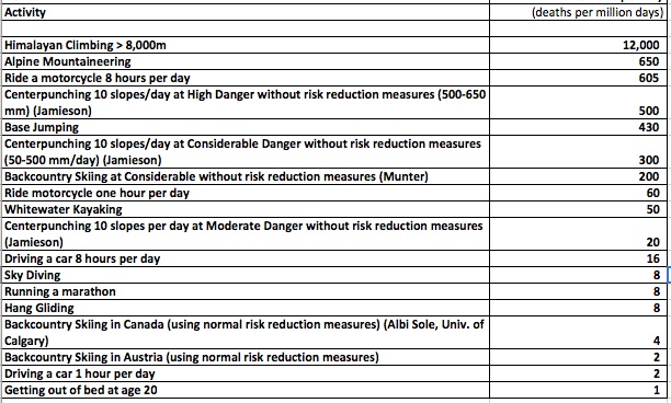 So what is the risk of recreating in avalanche terrain compared to other activities? The list below is in units of a “millimort”, which is one death in a million. I have converted all the numbers into millimorts per day so we can directly compare activities using consistent units. A Millimort is a convenient unit because one millimort is the chance of dying per day for an average 20-year-old from all causes.
