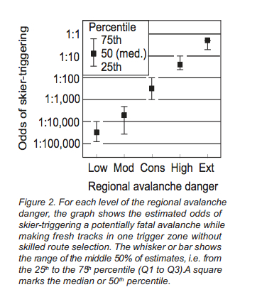 The authors go on to explain, "The calculated avalanche risk from skiing increases roughly 10-fold with each level of regional avalanche danger. This follows from the approximate 10-fold increase in triggering probability when the regional danger increases by one level (Figure 2, based on the survey).