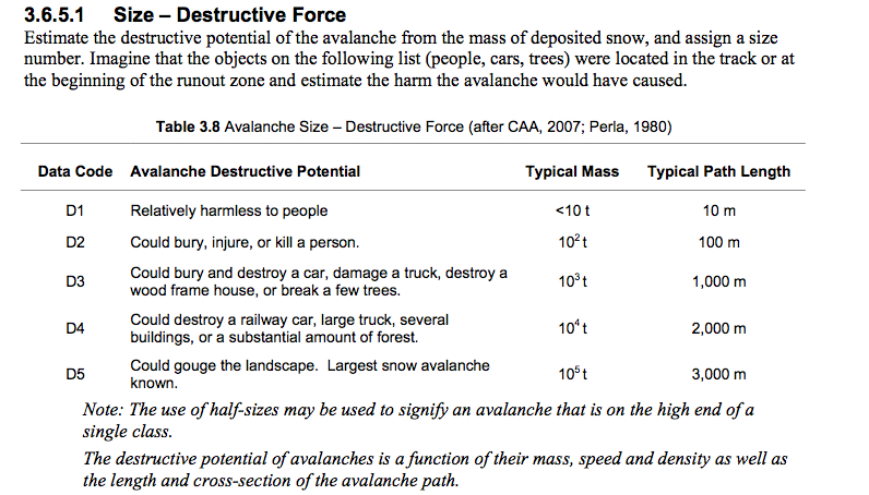 Size matters. And so do the consequences. Some of this has to do with terrain choices (ie - are you above a gentle runout or a bergschrund?) but ultimately it comes down to what we call the Destructive Scale. The following is what we use to communicate among 'professionals', as taken by the SWAG (Snow, Weather, and Avalanche Guidelines; Greene, et al).