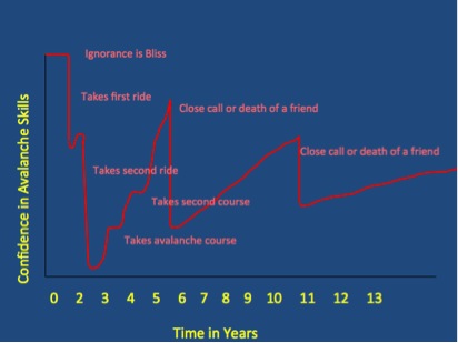 More years go by in the mountains and you will hear of another close call or death of someone you know (confidence drops, but not as dramatically) as time passes our confidence starts to increase at a slow and steady pace and becomes much more reliable, but never becomes perfect…