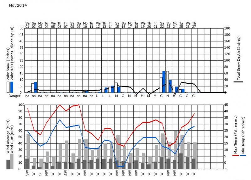 This is an aspect-elevation rose of the avalanche activity from the last week. You can see that all the avalanches have been on elevations above 9,000' and on slopes facing northwest, north andnortheast. As usual, northeast is always a popular aspect with faceted snow because it's cold and the predominant west winds load easterly-facing slopes.