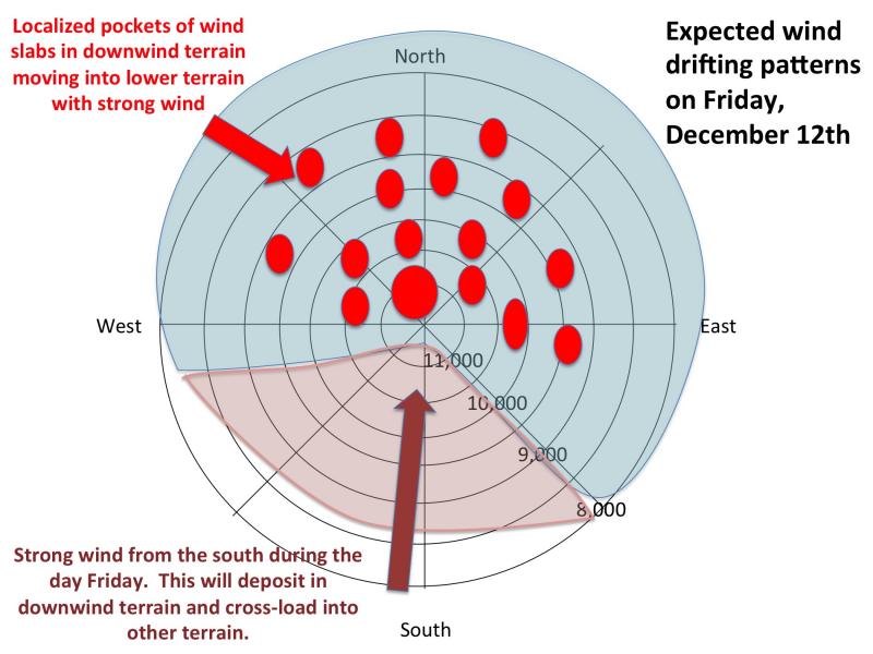 Unfortunately, this looks like a huff-and-puff-and-not-much-fluff storms. Lots of wind and not much snow (3-5 inches maybe). So the wind slabs will likely be our largest concern because wind can deposit snow rapidly and the resulting slab is dense, heavy and propagates a fracture very well. The trouble with thenew snow expected to startfalling on Friday night, it will conceal the fresh wind drifts so the new snow will make things quite tricky. It will probably not weigh enough to overload the weak surface snow but it will be "sucker snow" which entices you to have fun until you find one of the buried wind slabs that shatters like glass underneth you.