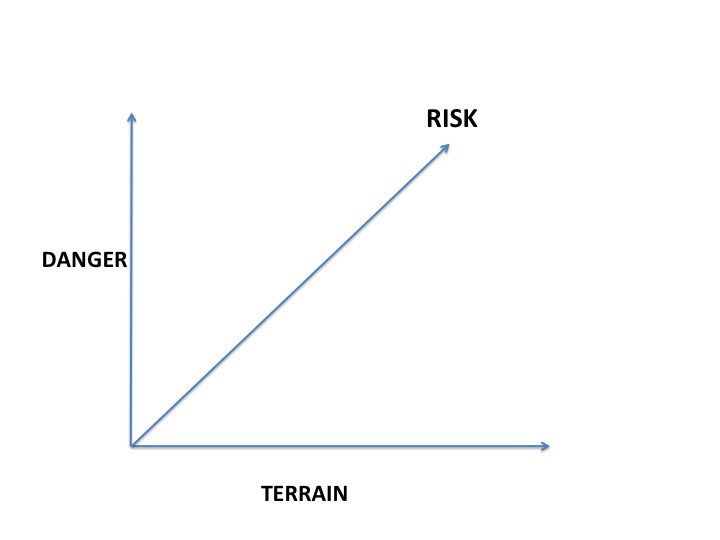 I like what you have to say about the perception of risk and how people can be lulled into complacency, but I have to point out that your graph of what people think their decision making is like makes no sense at all. You say that if risk is to remain constant, "...then D (Danger) and T (Mountain Terrain) must have an inverse relationship to one another." This makes some sense, however the graph on the left shows exactly the opposite relationship. In your graph the value of X increases as the value of Y increases. This is a direct relationship, not and inverse relationship. If you were to graph an inverse relationship the line would start high on the Y-axis and slope down towards the the X-axis as you move further to the right. In other words, as the value of Y increases the value of X decreases and vise-versa.