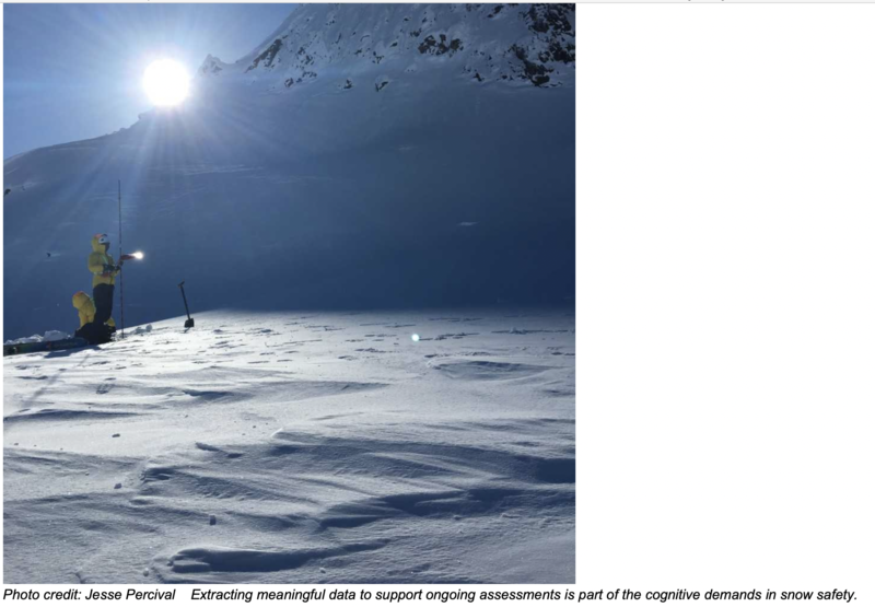 But that example is a bit of an outlier because to uncover many of the meaningful signals or cues about what is happening in the snowpack you literally have to go digging to extract the right kinds of information. In other high consequence monitoring environments like nuclear power plants or intensive care units there are often layered sensor networks providing real time data to aid the operator in monitoring the state of the system across multiple variables. In those environments, threshold alarms or visual displays can highlight minor variations to inform the plant operator or nurse that the state is changing. When out in the field, snow safety professionals have to accurately perceive often very subtle cues. (pull quote) And, even when assessing already existing data from previous assessment reports or online databases, the information is presented in a way that requires mental effort to extract the meaningful data from the background information.