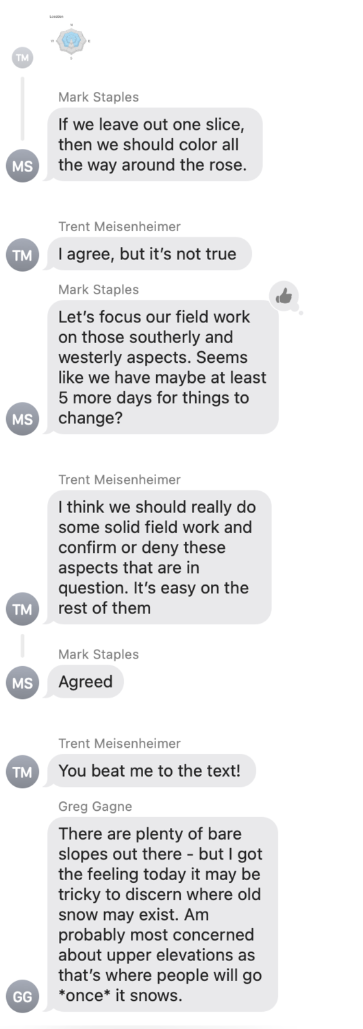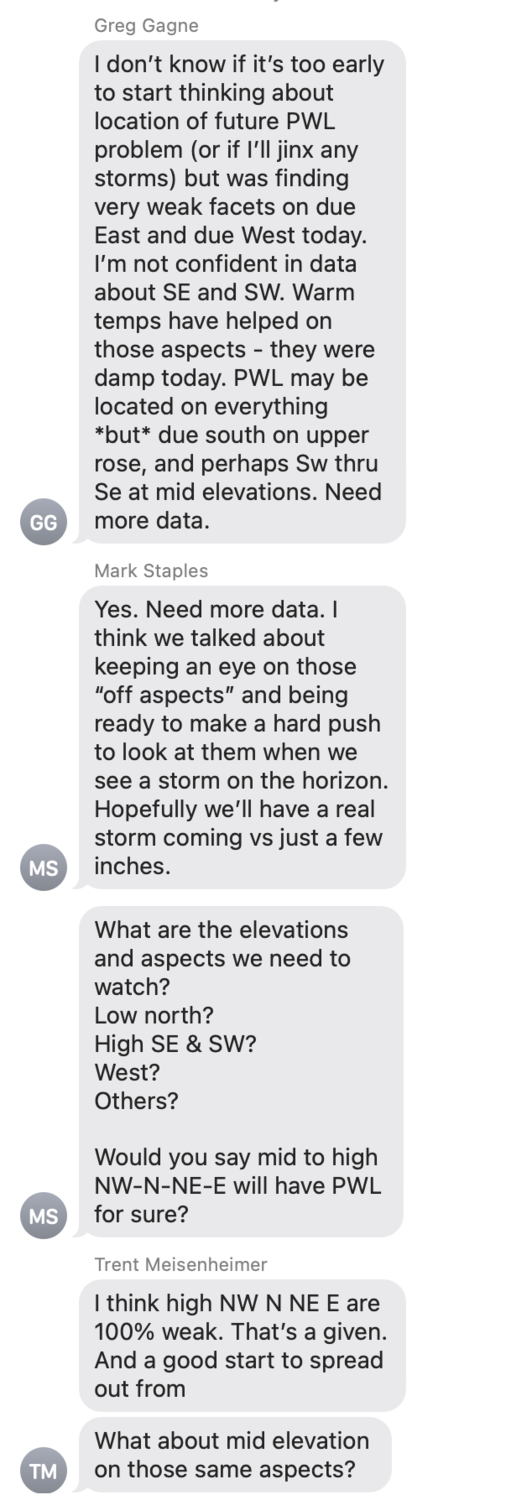 I wanted to share our text string from Saturday night (Dec 5th) among UAC forecasters in the SLC office: Mark Staples, Nikki Champion, Trent Meisenheimer, Greg Gagne, and Drew Hardesty. This is a good way to pull the curtain back and show what goes on behind the scenes. It's an example of the near continuous communication that we have regarding current and future conditions.