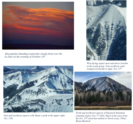 The first storm occurred on October 25th and deposited around 1” of SWE equating to 7” of snow at the La Sal Mtn SNOWTEL site (9,578’ elevation). Observations from Oct. 27th revealed variable snow coverage, with wind transport from the North. The pre-Laurel Peak weather station recorded NW to NNW winds with gusts in the 50-mph range, both during the storm and immediately afterwards.