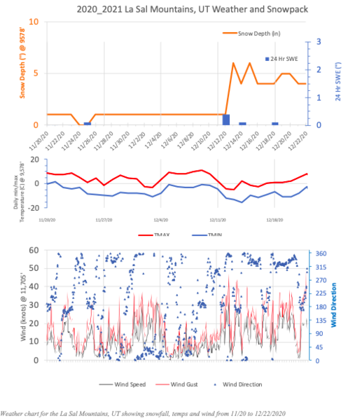 Fall and early winter of the 2020-2021 season has been marked by several relatively small early season storms. Drought persists with the snowpack in the La Sals at 19% of median as of 12/23/2020. Currently, there is 0.8” of snow water equivalent (SWE) at the SNOWTEL site. While this site sits at a relativity low elevation, it does provide a good record of snowfall events and temperature trends.