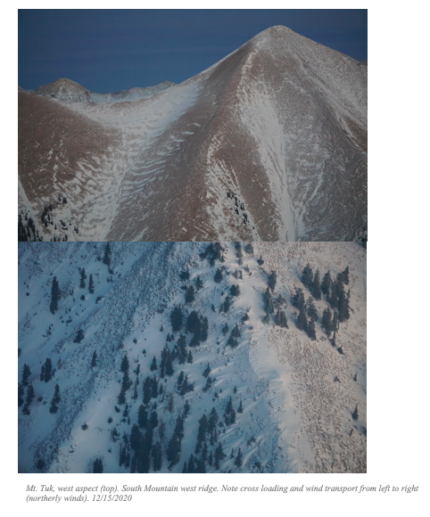 On December 12th, and moderate storm clipped the Sierra La Sal bringing 0.4” of SWE. Storm totals ranged from 6" of snow at the Geyser Pass trailhead to an estimated 8"-10" in Gold Basin. This is the same system that dropped much more snow in Colorado and created unstable conditions that unfortunately set the stage for three fatalities on 12/18 and 12/19/2020. Ridge top winds during the storm blew in the 20-30 mph range from the SW before backing off and shifting to more northerly directions. As the front passed and into December 15th, winds increased from the north and blew in the gusted into the 30-40 mph range.