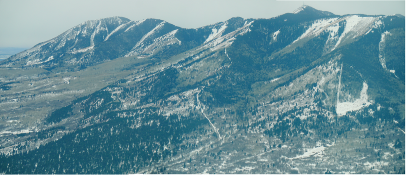 Looking southwest towards the east face of the Abajo Mountains on 12/27/2020 (aerial photo by C. Benson).