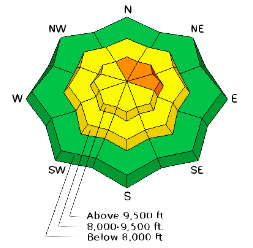 Danger Rose: The danger rose is used to depict avalanche hazards on varying aspects and elevations. The rose is designed to represent a perfectly conical mountain viewed top-down, for example, the top section represents north-facing low-elevation areas. Learn more about the Danger Rose here.