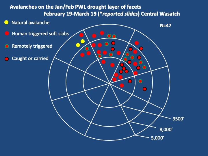 If the wheels came off in Ogden and Provo at high elevations, but not upper Salt Lake zones, what's the difference? People. I think there's a good chance skier compaction interrupted the connectivity of the facet layers in many high elevations zone in the SLC forecast area. I didn't check to see where those 3 upper elevation slides were between March 7 and 19, but I'd put money on them NOT being typically high traffic zones.