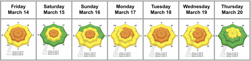 A classic March mix of weather and avalanche conditions. The day started partly cloudy with temperatures in the mid-teens but quickly warmed to the low 40s°F by midday. Steady southwest winds picked up in the afternoon, with gusts hitting 60+ mph on the high peaks.
