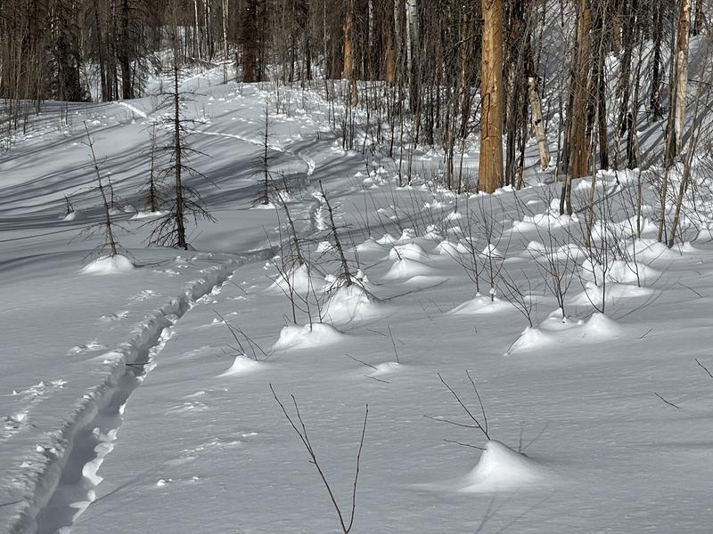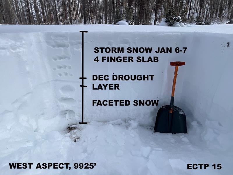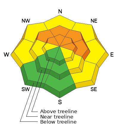 A MODERATE danger exists on W and SE aspects where you can detect recent deposits of wind drifted snow. West facing slopes also harbor weak, faceted snow underneath, and deeper, more dangerous avalanches are possible in these areas.