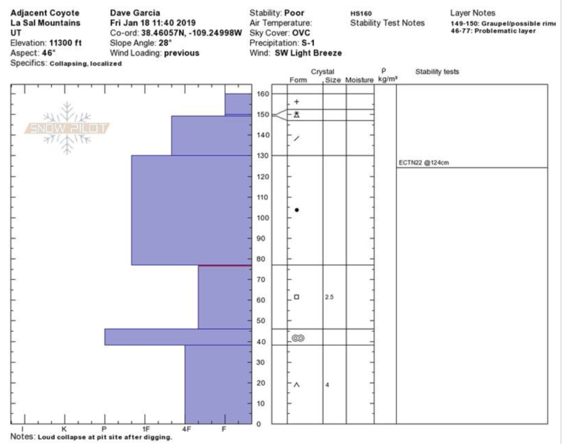 Snow total since Tues night is 18" with around 2" of water weight. A pretty good load for our fragile snowpack. Winds from all directions have blown, drifted, and jacked the snow surface in upper elevation, wind exposed terrain. The best quality, and safest snow conditions will be found on low angle, wind sheltered terrain. Base depth in Gold Basin is 54" and we are now at 108% of normal!