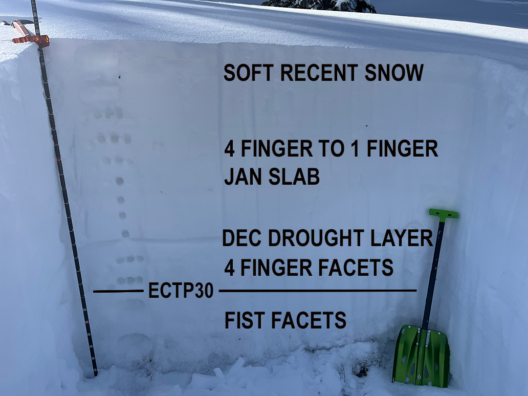 The avalanche danger remains CONSIDERABLE on steep slopes near and above treeline that face W-N-E-SE. Although the odds have been slowly decreasing, human triggered avalanches, 2'-6' deep failing on a buried persistent weak layer remain possible to likely. Continue to avoid slopes steeper than 30 degrees in these areas.
