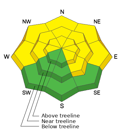 Today you will find a MODERATE danger for triggering avalanches on a buried persistent weak layer on slopes that face W-N-SE The danger is greatest on steep northerly aspects near treeline and above where accumulated and drifted snow has built slabs 2'-4' thick over this weak layer. While there is a lower likelihood of triggering an avalanche right now, the consequences of being caught in a slide remain dangerous.