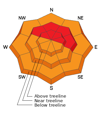 A HIGH avalanche danger exists on all slopes that face NW-N-E near treeline and above for triggering an avalanche on a buried persistent weak layer. Heavy snow and strong winds have overloaded this weak layer creating very dangerous conditions. Human triggered avalanches are very likely today on these slopes. A CONSIDERABLE danger exists for triggering an avalanche on this buried PWL on most other slopes and human triggered avalanches are likely. There is a CONSIDERABLE danger of triggering avalanches in the new snow on all steep slopes at all elevations.