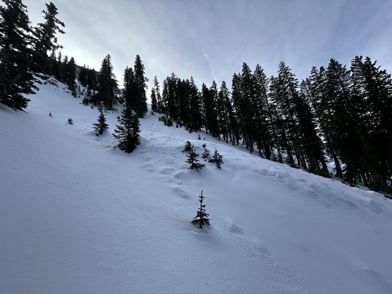 The skiing that is available right now is better than you might think when you consider that we only have 2 feet of settled snow and it's just the first week of December. There has been almost no wind to speak of in the mountains, and this has preserved the few inches of soft powder on the surface. You can still find fun turning on low-angle northerly slopes. Yesterday, we were surprised by how well the solar aspects skied. Sunshine and warm temperatures made for soft, spring-like turns on the sunny slopes. This may actually be the best game in town right now. If you ride slopes that face South and Southwest, you can avoid the persistent weak layer problem and still get some fun turns in. Keep in mind, that coverage on these slopes is very thin, and you need to look out for rocks and other obstacles. If you choose to ride Northerlies, travel advice is to keep your slope angles below 30 degrees as the persistent weak layer problem will be with us for some time.
